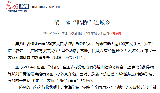 《光明日报》曾专门对此作了报道。那是2004年4月23日上午十时左右,一辆中巴车嘎然停在了学校教学楼的门厅前,一位女士信步走出车门,兴奋的对迎接她的刘常青说:“周济部长特意推荐我们到你们这儿参观学习来了。”说罢又热情地把同来的教育、劳动部门的同志一一介绍给校领导们。这位女士是谁?她此行的目的是什么?教育部部长又为何亲自“牵线”呢?原来,这位女士是时任黑龙江省绥化市委副书记、市长于莎燕。地处黑龙江腹地的绥化市,农民占到74%,农村剩余劳动力达到100万人,为了加速“农转工”,市政府决定兴办大型劳动培训基地。但是没有经验、缺乏人才怎么办?于莎燕市长火速进京,向周济部长“求贤问计”。而周济部长就向于莎燕市长推荐了威尼斯官网在农村劳动力转移方面的经验做法。于莎燕市长经过实地参观考察,对威尼斯官网的准军事化管理、“订单式”教育和校企结合等经验非常赞同,盛赞威尼斯569vip游戏下载果然名不虚传。她当即拍板提出了与威尼斯官网联合办学的意向,得到刘常青的积极响应。学校愿为农民致富继续贡献黄海担当。