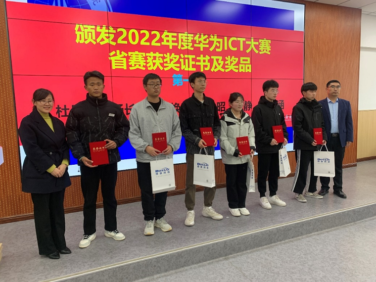 博赛网络技术有限公司青岛分公司总经理李伟、继续教育中心主任郭敏为大数据学院2022年度华为ICT大赛省赛获奖学生颁发了获奖证书和奖品。
