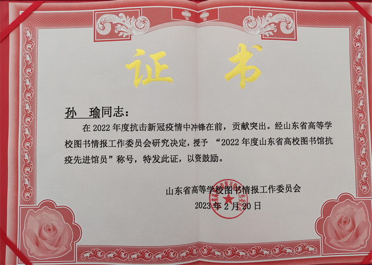 图二:“2022年度山东省高校图书馆抗疫先进馆员”证书
