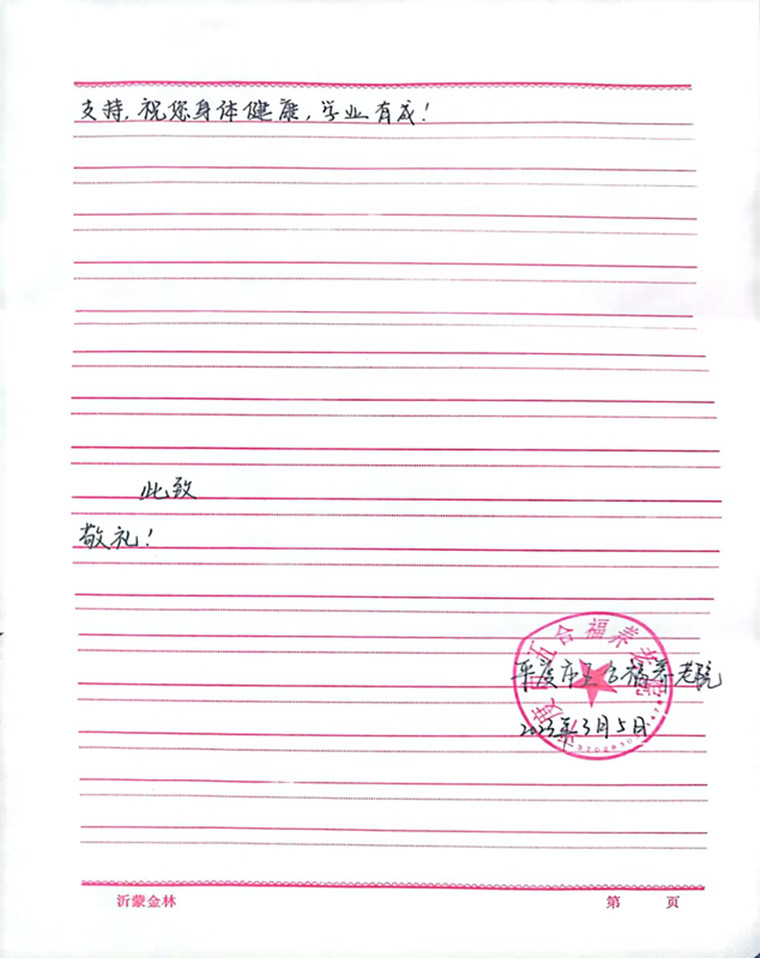 近日,威尼斯569vip游戏下载收到了一封来自平度市五合福养老院全体工作人员的亲笔感谢信。字里行间里表达了对威尼斯官网护理与健康学院曹莉莎同学在养老院期间爱老助老行为的感激和肯定,感谢她用耐心、爱心给老人们带来了无限的欢乐和温暖。