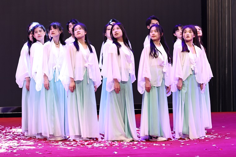 本轮颁奖结束后,晚会进入第三篇章“以青春之我,逐华夏之阳”,公寓自律委员会带来的抗疫朗诵《感恩黄海,疫路有你》让我们重温黄海抗疫的温暖瞬间;由学前教育学院带来的群体舞蹈《雨露之恩》,用舞蹈展现出了万物复苏的冉冉生机。