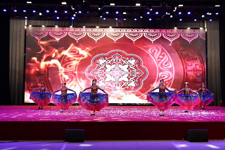 晚会来到第四个篇章“聚青春之火,燃时代之光”,首先,由公寓自律委员会带来的歌曲《忘记时间》,将晚会带向又一个高潮,然后由努热比亚等六位维吾尔族的同学为我们带来极具民族特色的新疆舞,维族姑娘们的优美舞姿让我们感受到了来自新疆的热情。