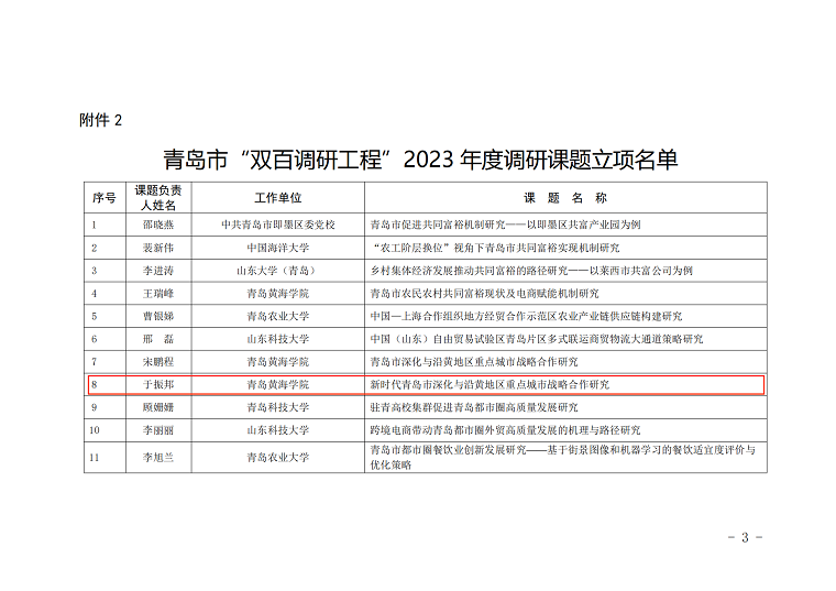 日前,中共青岛市委宣传部、青岛市社会科学界联合会下发了《关于公布青岛市2023 年度“双百调研工程”课题立项结果的通知》,创新创业教育学院于振邦老师申报的《新时代青岛市深化与沿黄地区重点城市战略合作研究》获得立项。