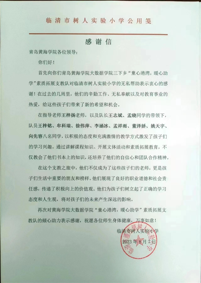 暑期实践期间,大数据学院志愿服务小分队在山东省临沂市开展了“繁星璀璨