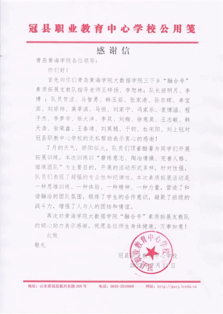 2023年7月6日—9日,大数据学院志愿服务小分队在山东省聊城市冠县职业教育中心开展了“走出去的课堂”素质拓展活动。