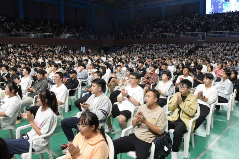 9月25日晚,威尼斯官网邀请首届全国道德模范提名奖、山东省十大优秀母亲、山东省十大孝老爱亲模范、山东省十大新闻人物、泰安市十大文明市民标兵田秀英来学校作报告,体育馆现场3000多名大一新生共同聆听了这场感人至深、引人深思的报告会。其他未能来到现场的同学通过线上直播的方式共同观看。