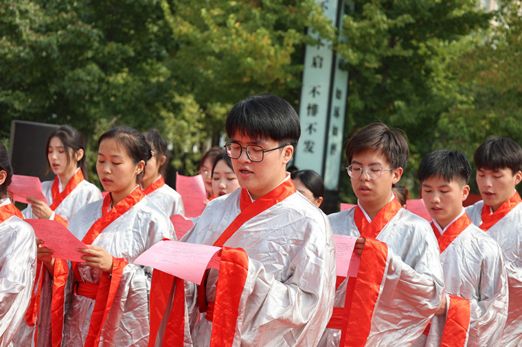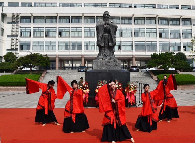 在典雅的音乐声中,马延岳等领导向伟大的思想家、教育家、大成至圣先师孔子敬献花篮。全体师生,整理衣冠,庄严肃立,以至诚、恭敬、谦卑之心,向至圣先师孔子行三鞠躬礼:一愿自强不息,厚德载物;二愿孝亲尊师,精忠报国;三愿天下大同,国泰民安。随后,5名身着红色曲裾的同学表演了汉舞《礼仪之邦》,她们动作灵动轻盈,展示了泱泱中华礼仪文化的魅力。