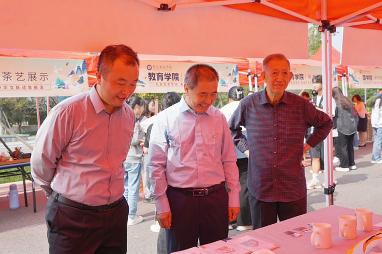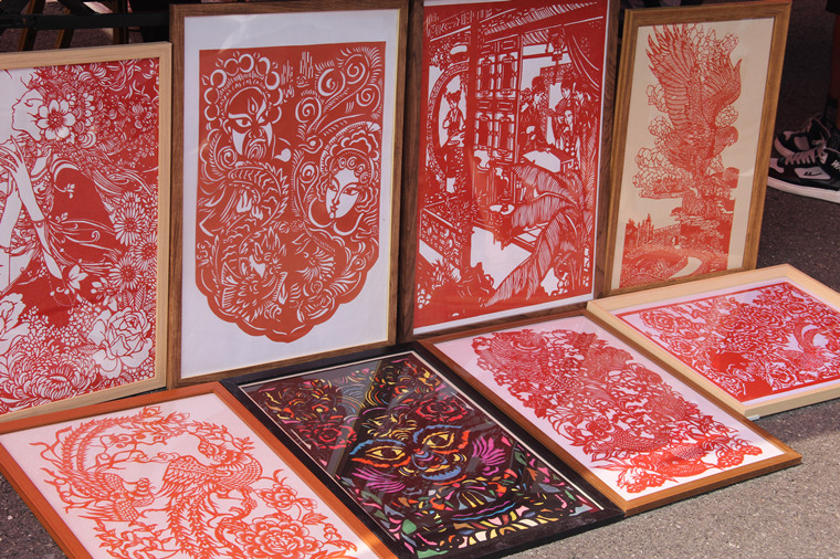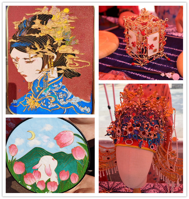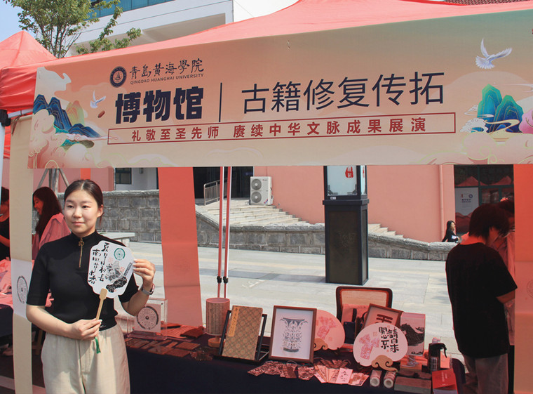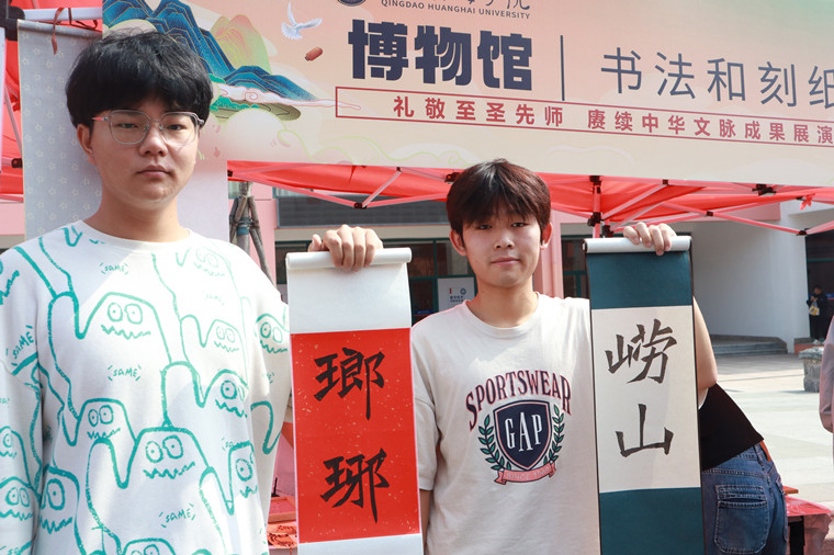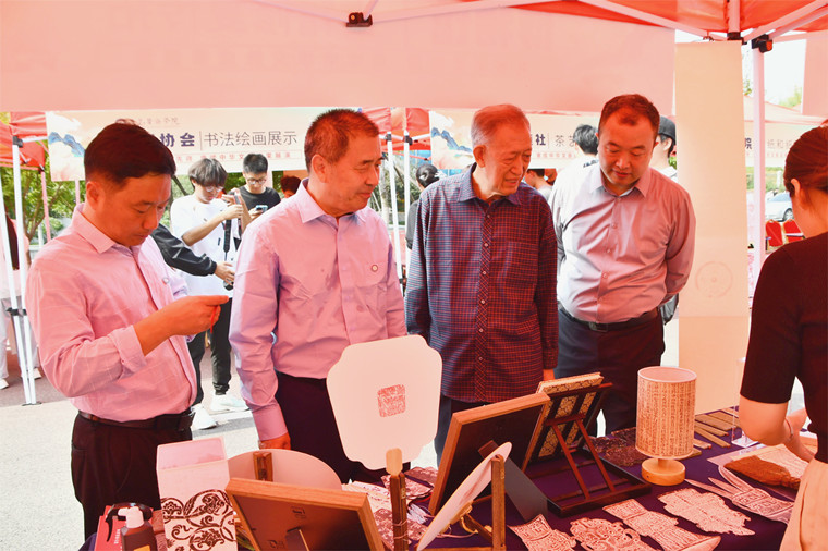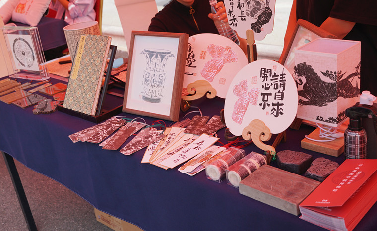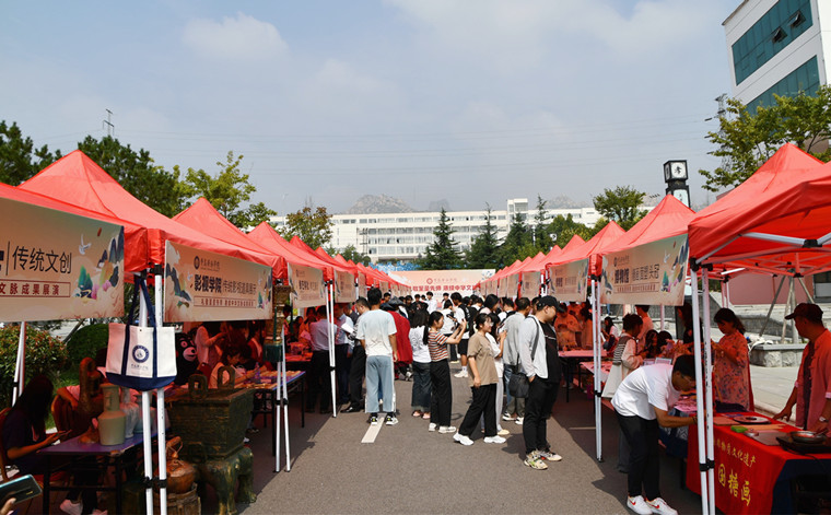 此时的八德路,汇集了民间剪纸、书法国画、布艺扎染、雕刻、传拓等16个省市级非遗技艺项目,23个摊位,将沉浸式体验与传统元素融为一体。掐丝珐琅作品线条折转流畅,纹饰精美细腻,制作工艺考究;笔酣墨饱的书法作品,跌宕有致、正倚交错;美术作品或悠远清逸或色彩丰富或线条流畅……传统的书法、篆刻、草编、布艺、扎染、绘画作品吸引了师生们驻足观看,不少学生拿出手机扫码购买自己心仪的手工艺品。