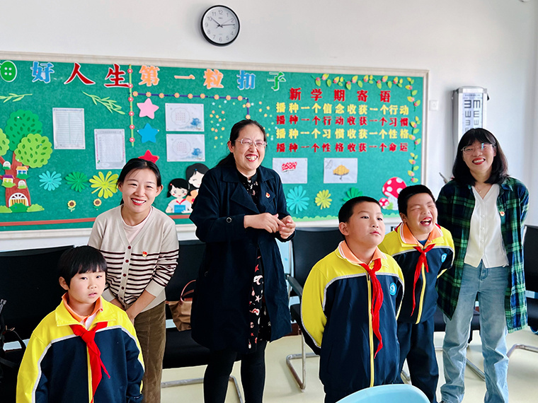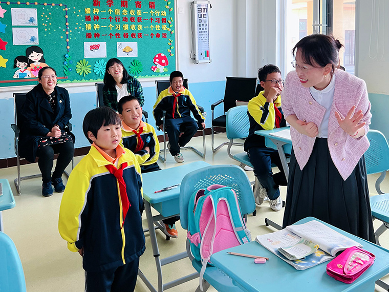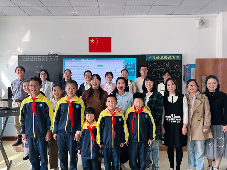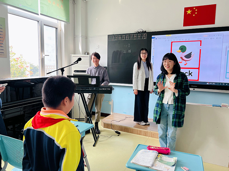 10月26日,外语系党支部的党员们先是克服了严重的晕船困难,后又乘坐电瓶车,早早来到了灵山岛小学。外语系的老师们与学生们开展英语角互动游戏。师生们通过“你来比划我来猜”小游戏迅速熟识,老师们的肢体语言和孩子们的精准描述相得益彰,教室里掌声不断。