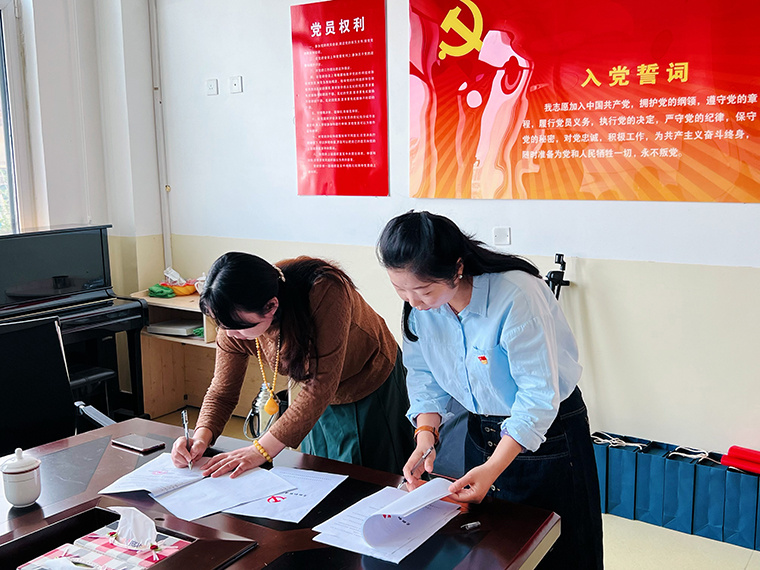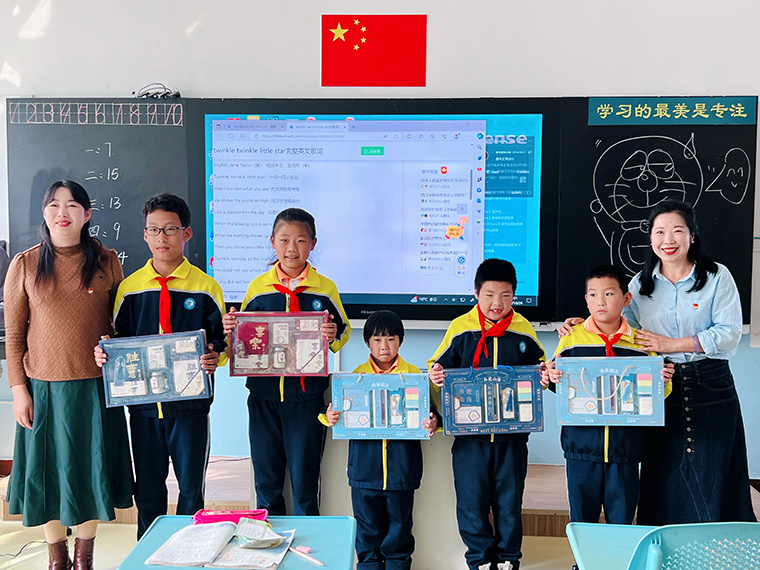 孙伶莉代表外语系党支部为学生们颁发精心准备的文具礼盒